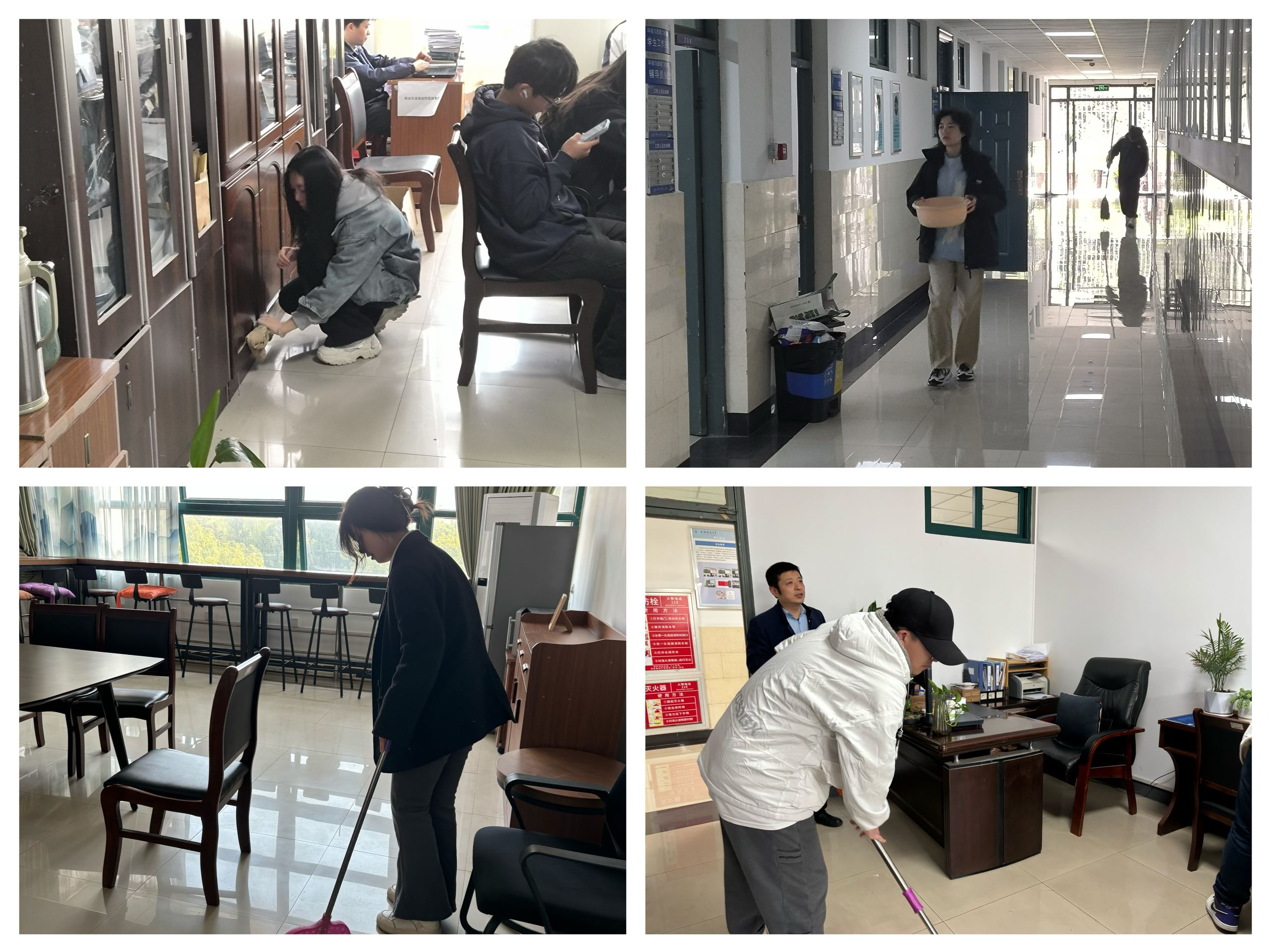 志愿者们手持拖把抹布,为学院会议室、教工小家家以及心理咨询室的墙壁、地面、柜子等进行打扫,活动中,同学们激情洋溢、热情主动,展现出志愿者们阳光向上、精神饱满的状态。随着最后一位同学放下打扫工具,本次大扫除志愿活动也迎来尾声,在同学们的辛勤付出下,学院环境楼焕然一新,学院老师也纷纷对参与本次志愿活动的同学表示感谢。