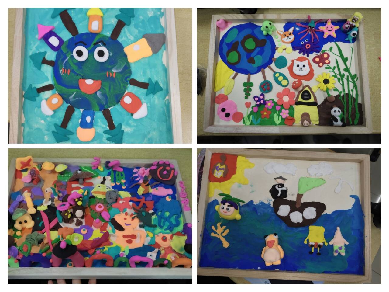 主持人首先向同学们描述了当前地球面临的环境问题,并呼吁大家践行环保理念,同时讲解了粘土创作的注意事项和制作技巧。同学们自由组成若干团队,在领取到纸黏土环保材料后,团队协同合作。经过同学们的精心雕琢,既有森林、动物等自然元素,也有风力发电机等环保科技符号,画框内既有对地球现状的反思,也有对生态保护的呼吁,充分表达对绿色未来的憧憬。