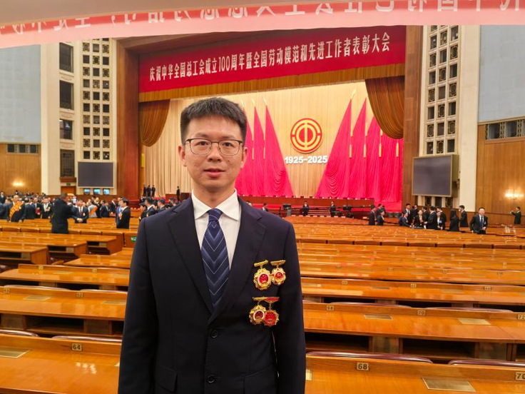 本网讯 4月28日上午,庆祝中华全国总工会成立100周年暨全国劳动模范和先进工作者表彰大会在北京举行。beat365在线唯一官网2011级给排水专业校友、合肥水务集团“雷锋精神”听漏队队长张杨被授予“全国劳动模范”称号,在人民大会堂现场参会。