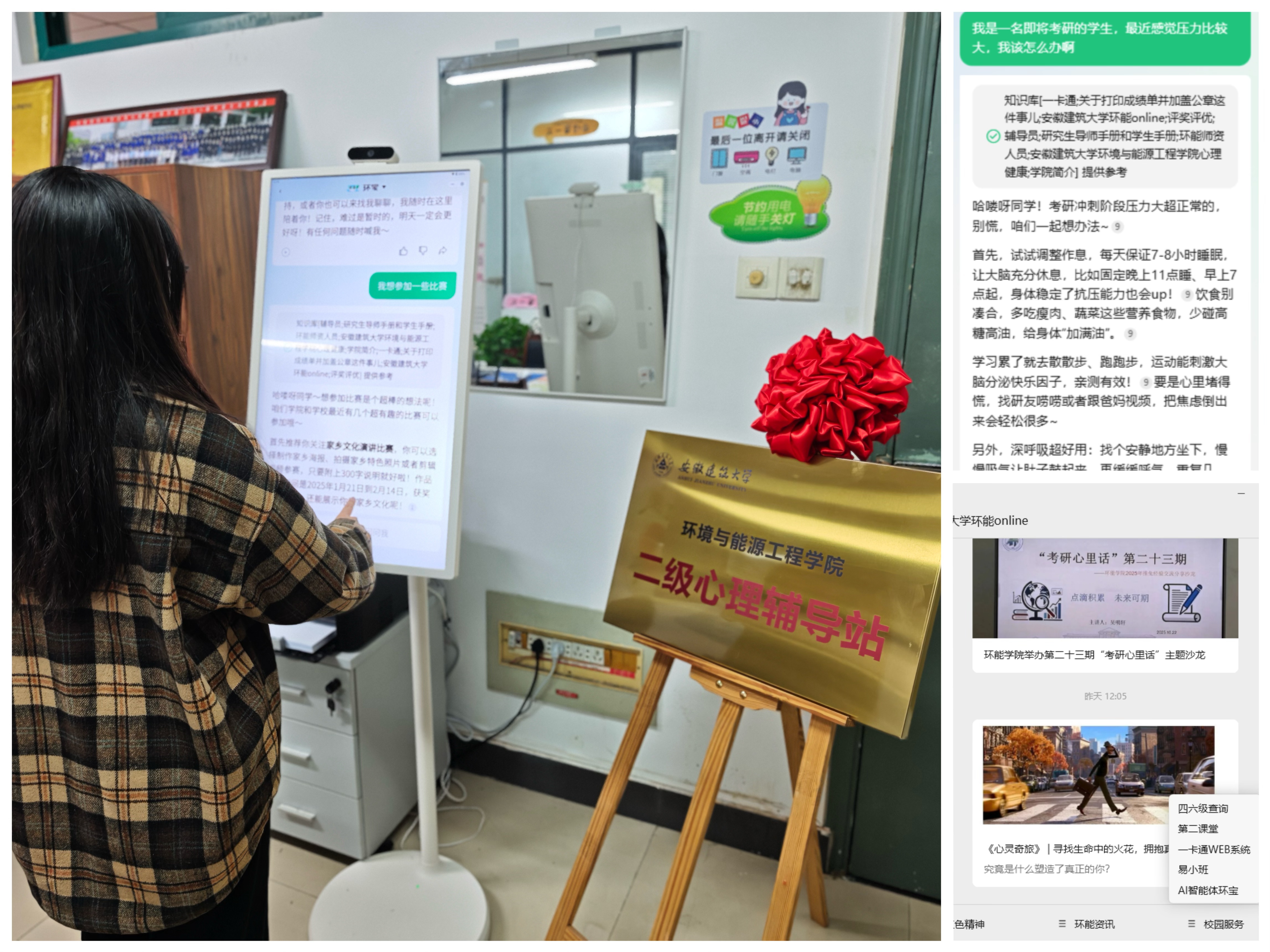 此次二级心理辅导站的升级启用,不仅标志着学院心理服务体系的全面提升,更为学院心理育人工作开启了新的篇章。未来,环能学院将继续秉持“以学生为中心”的理念,依托形式多样的活动与先进的科技手段着力建设特色二级心理辅导站,为同学们提供更加丰富、贴心的日常心理支持,共同营造一个温暖、积极、健康的校园氛围。(作者:韩三青  一审:侯晓云 二审:王昊禾  三审:戴前宏