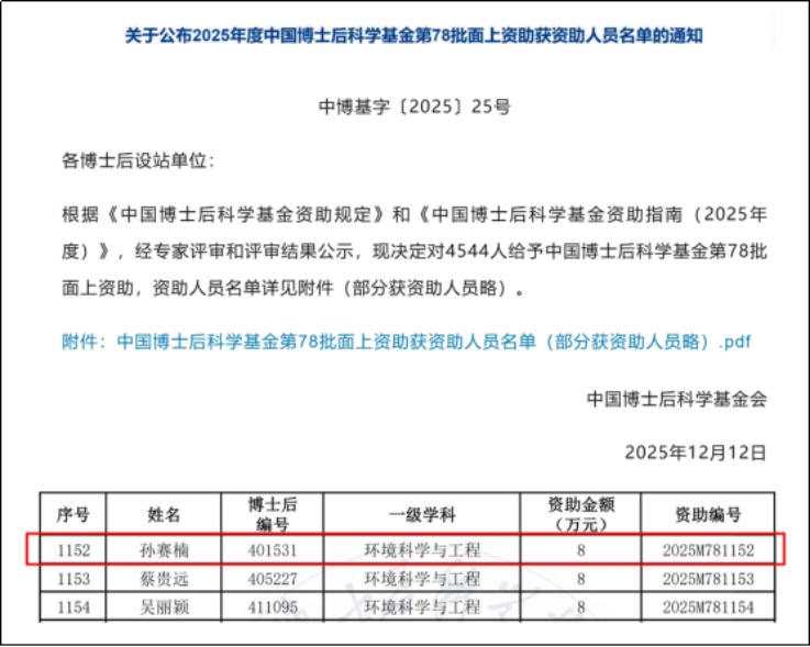 本网讯 近日,中国博士后科学基金会发布《2025年度中国博士后科学基金第78批面上资助获资助人员名单的通知》,beat365官网环境与能源工程学院博士后孙赛楠成功获得该项目资助。