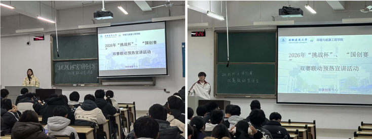 本网讯 为激活2025级学子创新创业热情,深耕“双创”育人品牌,助力新生精准把握“挑战杯”大学生创业计划竞赛与“国创赛”核心规则、抢占赛事机遇,beat365在线唯一官网环境与能源工程学院团委创新创业中心以“走进班级、分批次全覆盖”形式,在紫云路校区逸夫楼5501、5503、5504、5505、5507教室接连开展为期一周的“2026年‘挑战杯+国创赛’双赛联动”专题预热宣讲,实现学院各专业新生班级全覆盖,为怀揣创新梦想的环能学子奉上一场贴合专业特色、满载实战干货的赛事赋能盛宴。