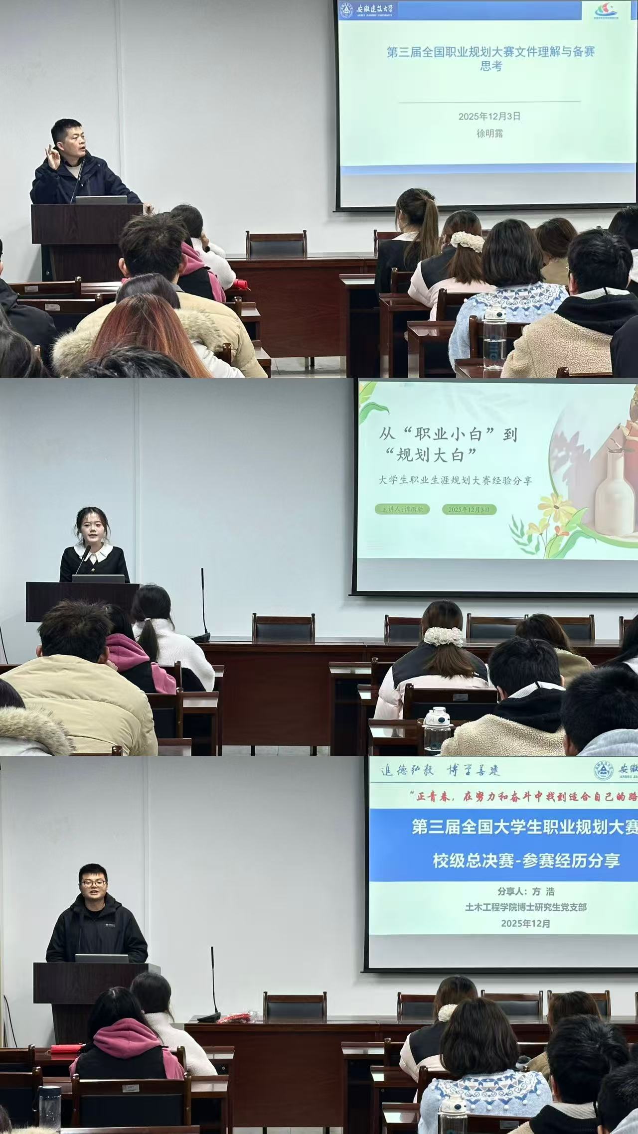 本次活动于12月初举行,聚焦职业规划核心需求,特邀一位职业规划大赛优秀指导老师与两位优秀获奖者进行分享。他们倾囊相授,为在场学子带来了一场兼具实用性与指导性的经验盛宴。分享会上,全国大学生职业规划大赛课程教学省赛银奖获得者徐明露老师深入剖析备赛逻辑,对相关红头文件进行专业解读,提炼出“研读文件定方向、精准选定参赛人选、科学组建攻坚团队、反复迭代优化作品、全流程模拟演练”的五步备赛策略,为学子搭建清晰的备赛框架;环境生态工程专业谭雨欣同学聚焦规划书核心环节,系统梳理规划书的完整结构,针对内容撰写、逻辑梳理等常见误区进行重点讲解,帮助同学们规避创作盲区;岩土工程专业博士研究生方浩结合多次参赛并获奖的丰富经验,从终身学习的视角出发,细致讲解了答辩中的语言表达、心态调整及问题应对等关键技巧。