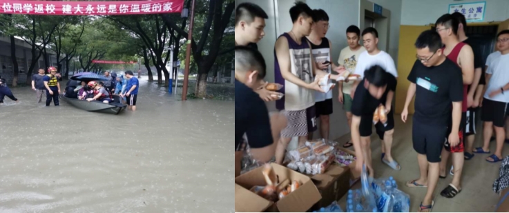 汛期来临前,党支部一线服务人员及时清理地面窨井盖积水漂浮物,党员干部身先士卒,趟着齐胸深的水,与物业公司人员对家属区挨家挨户摸排,帮助困难老人及时撤离,确保所有一楼的住户安全撤离;党员们在洪水过后,立即对残留淤泥、垃圾等进行清理冲洗、消毒,对图书馆内的徽派馆和书库等重要场所进行抢救性排涝,确保校园整洁有序。