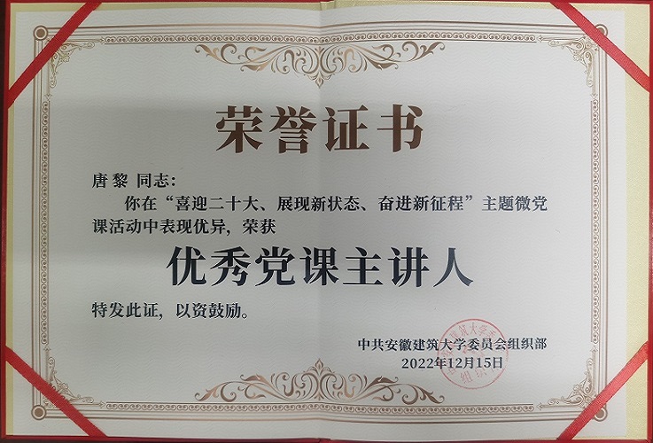 本网讯 近日,校党委组织部表彰了一批“喜迎二十大、展现新状态、奋进新征程”主题微党课获奖作品及获奖个人,集团总经理唐黎荣获“优秀党课主讲人”称号。