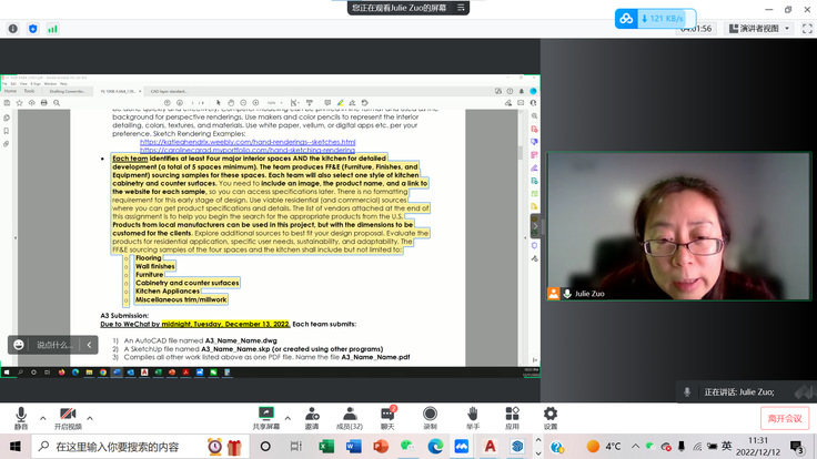 本网讯   本学期,为保证艺术学院环境设计专业中外合作项目教学工作的顺利进行,身在国外的外籍教师、和在国内的中方老师与同学们共同克服十几个小时的时差,灵活利用多种教学方法,在微信群、Zoom和腾讯会议等平台持续开展线上教学,保障了专业课程教学顺利进行。