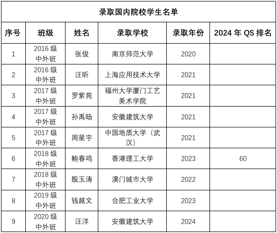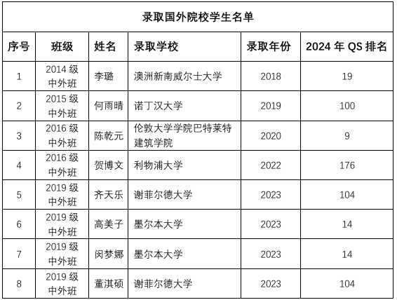 本网讯  环境设计中外合作项目自20149月获得教育部批准以来,学院高度重视该项目学生的教育教学、出国留学、考研升学工作,深化教学改革,加强学风建设,努力提高人才培养质量。既重视公共课、专业基础课程、专业核心课程教学,也重视英语口语及写作课程教学,每年邀请多名外教授课,以帮助出国的学生尽快适应国外教学环境。同时强化对考研学生的教育和服务工作,每年开设考研英语备考指导、考研报考指导、考研经验分享会、留学经验分享会等,为中外合作项目学生营造良好的备考环境。近年来,环境设计中外合作项目学生考研氛围逐渐浓厚,报考人数和成绩呈逐年攀升态势,被国内院校录取的人数有所突破,被国外院校录取的人数也稳步提升。以下为近年来考研录取学生名单: