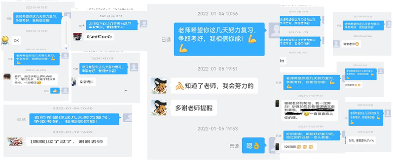 “严师出高徒”,“大匠诲人必以规矩,学者亦必以规矩”,王东老师深刻感受到教学中一定要做到严格要求学生,学生最终也能从中获益,多年以后会感觉到老师的用心良苦。大学生正处于人生崭新的起步阶段,教育对他们的一生有着决定性的影响,在课堂上他引导学生们树立正确的信仰和价值取向,坚持教书和育人相结合,将课程思政元素渗透到教学中去。每学期的开学第一节课,王东老师都要和同学们约定商量好上课的规矩,比如上课迟到必须从前门,不准走后门,上课不准出去接电话。有些规矩是老师和学生共同遵守的,而且老师还要身正为范,以身作则,这样学生才愿意遵守这些规矩。每学期总有个别同学存在旷课现象,遇到这种情况,王东老师一定要找到逃课的学生,利用课后时间与他们交流,了解他们逃课的真正原因,使他们端正学习态度,树立正确的人生态度。在无机非班级考试前,王东老师通过学习通平台和上学期考试没通过或者表现欠佳的十三名同学逐一联系(聊天记录见下图),鼓励和督促他们认真复习备考,结果考试中班级整体通过率有明显提升。有一次地质专业的几名同学遇到王东老师说:“王老师,还是您在上大学物理时对我们严格点比较好,有时候自觉性差,老师多督促一点,受益匪浅。”听到这些话,他感受到了学生的认可。