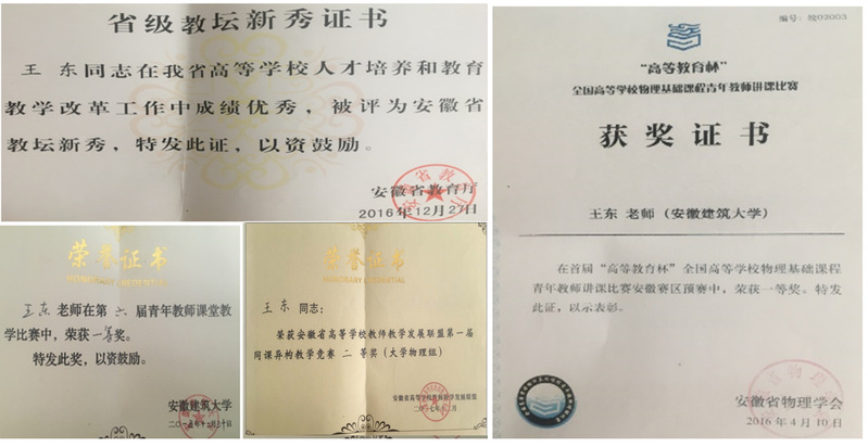 除了日常的实验室和党支部工作事务,王东老师潜心教学研究,不断提高教育教学质量,积极参加各级各类教学比赛,先后获得beat365在线唯一官网青年教师讲课比赛一等奖、安徽省教坛新秀、全国高等学校物理基础课程讲课比赛安徽赛区一等奖等多个奖项。同时获批省级和校级质量工程项目多项。