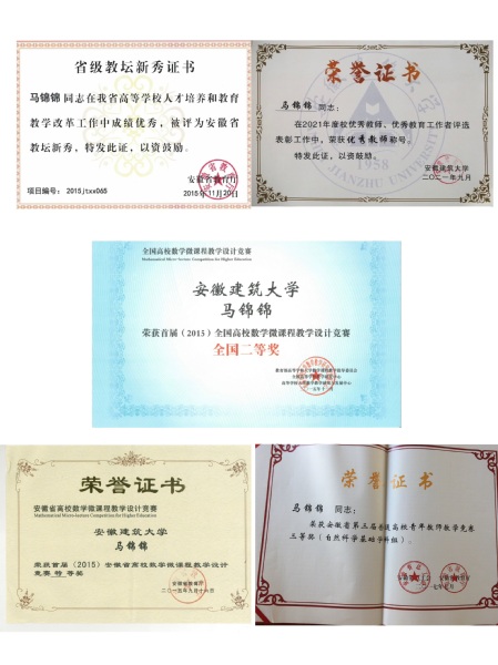 马老师潜心教学研究,总结教学中所获得的创新经验,不断提高教育教学质量,积极参加各项教学技能与创新比赛,在安徽省首届高校数学微课程教学竞赛中获得特等奖,首届全国高校数学微课程教学设计竞赛中获二等奖,安徽省第三届普通高校青年教师教学竞赛中获三等奖,学校的各类教学技能和创新比赛中也曾多次获奖,同时获批省级和校级质量工程项目多项。于2015年获得“安徽省教坛新秀”称号,并于2021年被评为“beat365在线唯一官网优秀教师”。在这些比赛中更好地与省内外同行交流学习,将所得经验进一步用于教育教学与改革创新中。