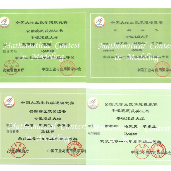 指导本科生参加各项专业知识竞赛和技能比赛,申报创新创业项目。其中,指导学生参加大学生数学建模竞赛共获得安徽省二等奖六项和三等奖六项,参加大学生数学竞赛获得安徽省三等奖两项。