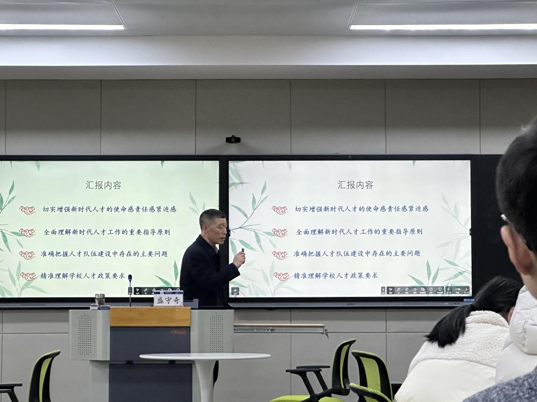 本网讯 为深化师德师风建设,提升青年教师科研创新能力,3月14日下午,教师发展中心在徽学楼举办新入职教师专题培训。校人事处副处长盛守奇、科技处处长雷经发分别围绕“大力弘扬教育家精神,加强教师队伍建设”和“加强有组织科研,提升科技创新活力”作主题讲座,50余名新入职青年教师参加培训。