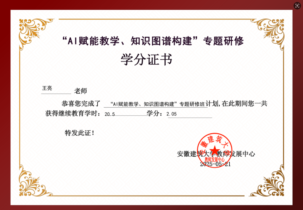本次AI赋能教学培训取得丰硕成果,各教学单位结合学科特点,探索AI技术在课程设计、课堂互动、学习评价等方面的创新应用,形成了一批具有示范价值的优秀案例。下一阶段学校将进一步落实立德树人根本任务,把加强教师队伍建设作为建设教育强国最重要的基础工作来抓,深入学习《教育部办公厅关于组织实施数字化赋能教师发展行动的通知》(教师厅函〔2025〕13号)精神,大力实施教师数字素养提升行动、数字赋能教育教学改革行动、教师发展模式数字转型行动、教师发展数字资源供给行动、教师发展数字治理行动、数字教育教师国际合作行动,持续推进AI技术与教育教学的深度融合,加强教师数字化能力培养,为学校高质量发展注入新动能,全力打造新时代建筑类高校数字化转型标杆。(图/文:徐洁;一审:范晨晨;二审:胡大洋;三审:潘和平)