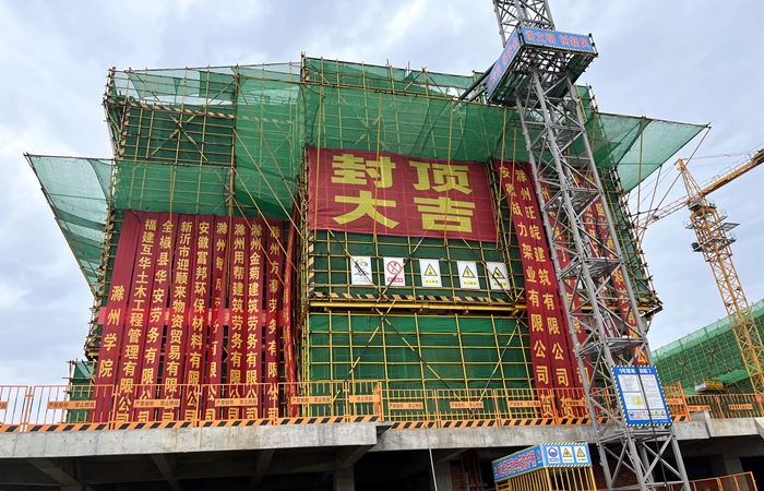 本网讯 9月12日上午10时18分,滁州学院会峰校区产教融合综合实验实训中心项目主体结构正式封顶,标志着项目将全面进入二次结构和装饰装修阶段。