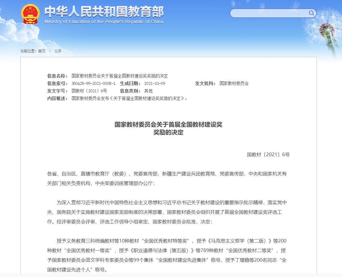 全国教材建设奖是新中国成立以来,我国首次设立的教材建设专门常设性奖项,是我国教材工作领域的最高奖项。该项荣誉的取得,是学校深入贯彻习近平总书记关于教材建设的重要指示批示精神的具体实践,是学校立足高质量发展阶段、积极建设高质量教育体系的成果检阅。学校广大教育工作者将以此为契机,不断增强责任感、使命感,积极投入包括教材建设在内的教学质量和人才培养质量体系建设,为学校“十四五”时期构建高质量教育教学新发展格局贡献更多实绩。(作者:陈晋;审核:储金龙)
