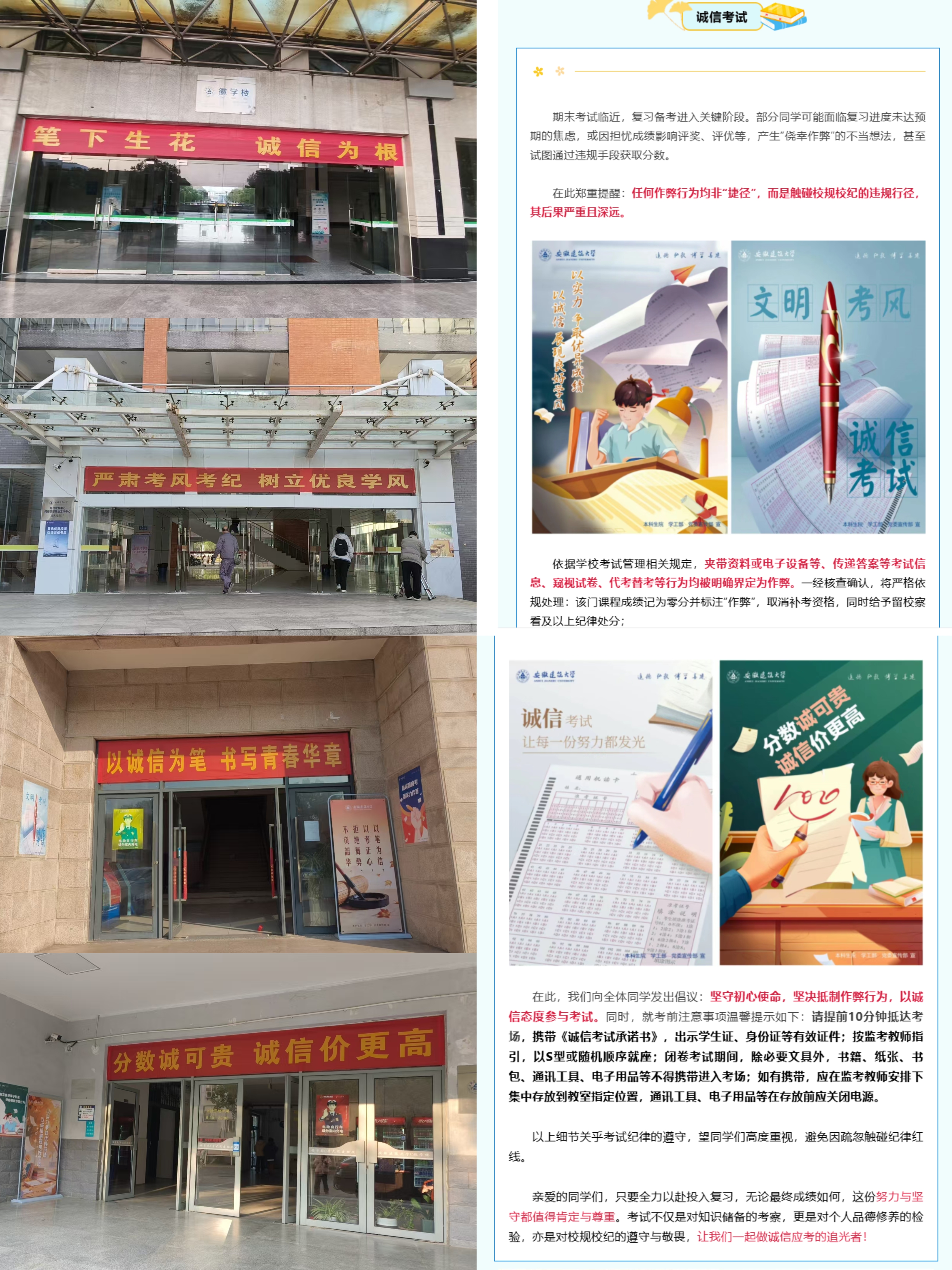 考前部署精准施策,夯实诚信育人根基。本科生院于考前充分发挥学校官方微信公众号的宣传引领作用,专项策划并发布《坚守诚信底线,践行文明应考——致全体在校学生的期末考试倡议》专题推文。以倡议发布为契机,结合校园内诚信考试主题标语、宣传海报等线下载体,围绕“诚信立身、诚信治学、诚信应考”核心主题,深化“明德于心、寓教于行”的教育理念,推动线上宣传引导与线下氛围营造深度融合、协同发力。通过构建全方位、立体化的诚信教育宣传体系,着力营造崇信尚实的考试氛围,有效扩大诚信教育的覆盖面与影响力,引导学生牢固树立诚信应考意识。
