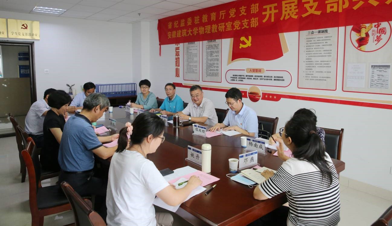 随后,晁新一行与数理学院物理教研室党支部开展支部共建活动,数理学院党政领导参加共建活动。支部书记余江应对物理教研室党支部的党建工作、党史学习教育、课程思政建设以及科研平台建设等情况进行了汇报。教育厅高教处檀俊对物理教研室的课程思政建设给予了充分肯定,并为《大学物理》课程思政的下一步建设提出了具体的指导意见。教育厅科研处李灿在科研平台建设方面提出了宝贵的建议,并强调了学术带头人培养、团队建设、高层次实验装置等在平台建设方面的重要作用。