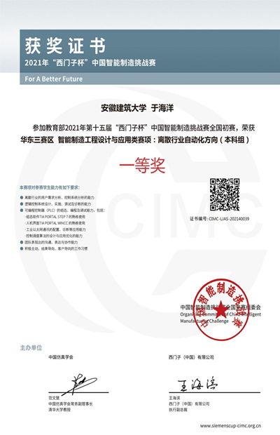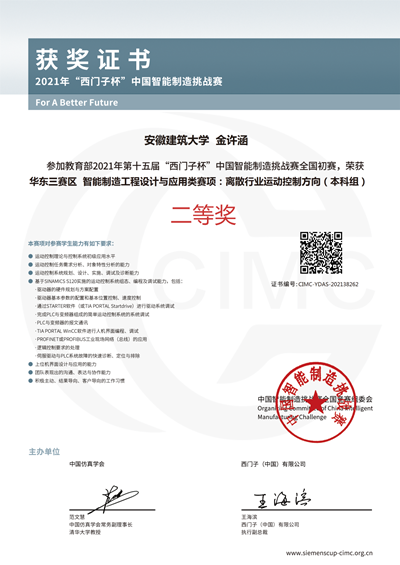 本网讯 近日,由安徽省教育厅,教育部高等学校自动化类专业教学指导委员会、西门子(中国)有限公司和中国系统仿真学会联合主办,安徽工业大学、宿州学院承办的第十五届“西门子杯”中国智能制造挑战赛安徽赛区暨华东三分赛区竞赛于7月20日至7月23日在安徽工业大学、宿州学院举行。beat365官网取得一等奖1项、二等奖5项、三等奖1项的优异成绩。