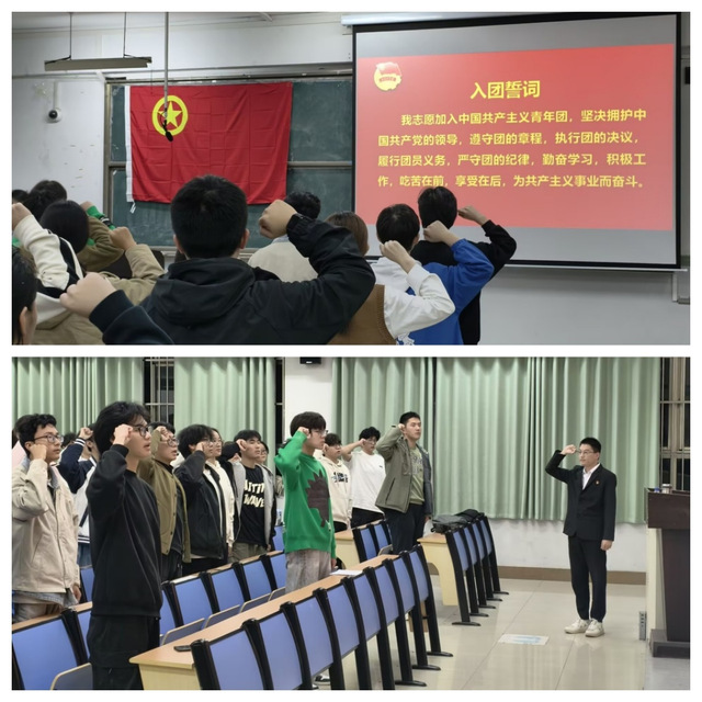 随后举行的重温入团誓词环节将仪式推向高潮。在学院团委委员22自动化1班高梦虎同学的领誓下,全体团员面对团旗,高举右拳,庄严宣誓。铿锵有力的誓言在教室回荡,展现了机电学子坚定的理想信念和奋斗决心。开班仪式在激昂的《光荣啊,中国共青团》歌声中圆满落幕。简朴而庄重的仪式,让每一位学员都深受教育和鼓舞。