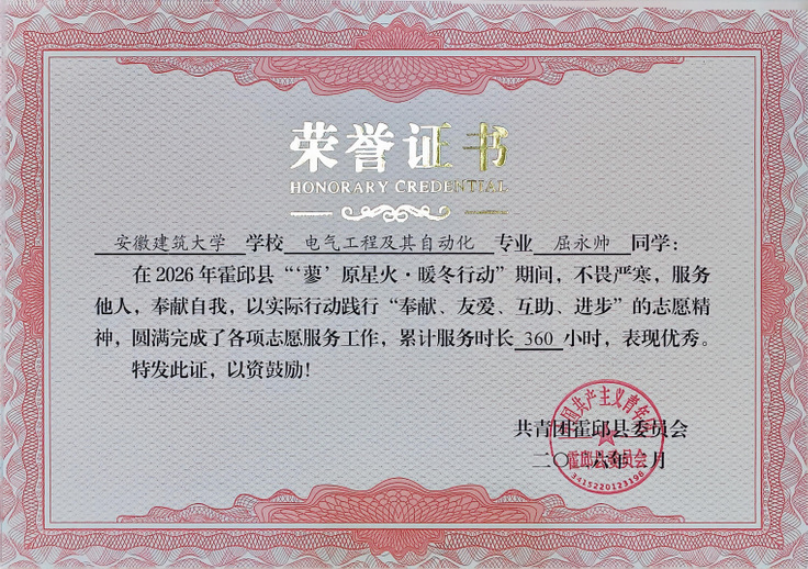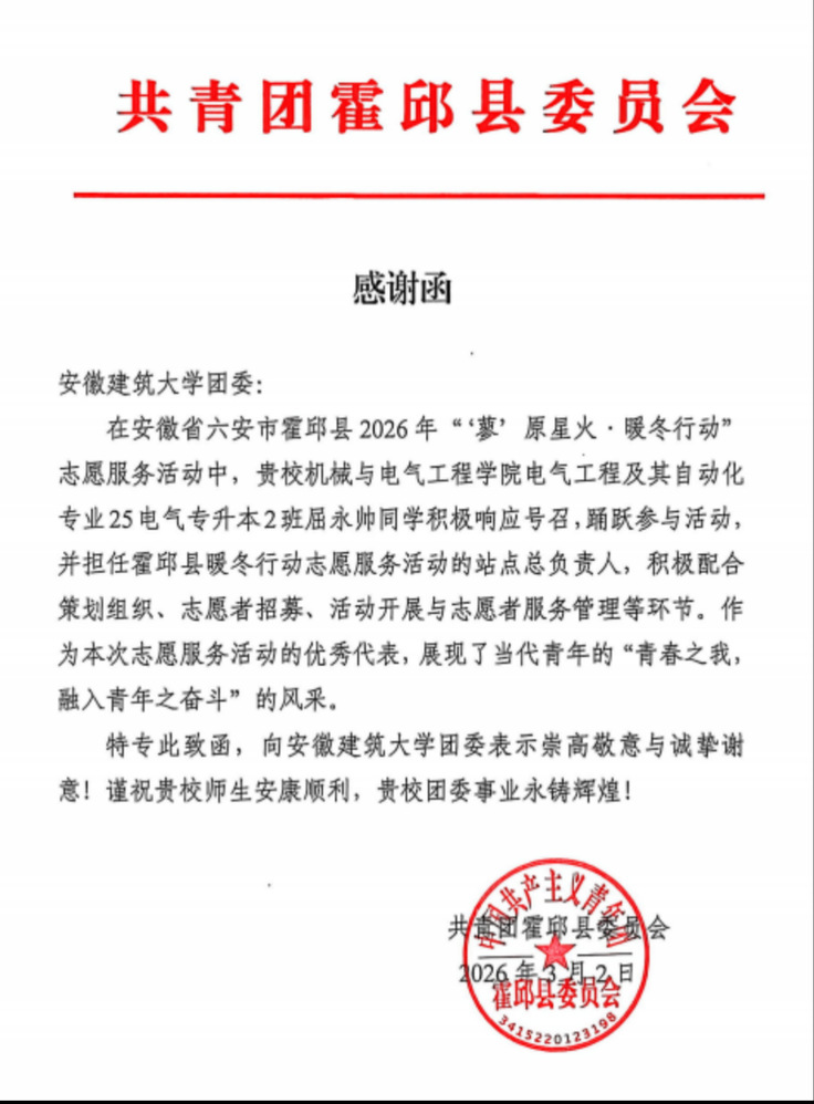 本网讯 寒假期间,beat365在线唯一官网机械与电气工程学院2025级电气专升本2班学生屈永帅,积极响应团霍邱县委号召,参加“蓼”原星火·暖冬行动志愿服务,担任全县4个核心站点总负责人,以出色表现获得团县委致函表扬。