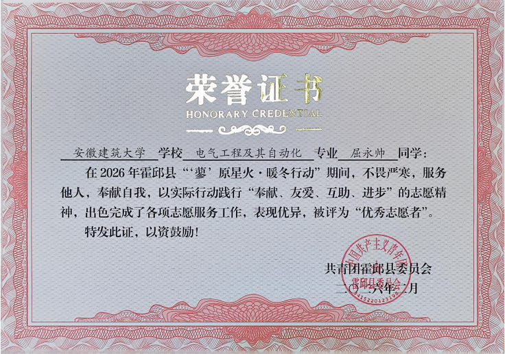 机电学院团委始终注重引导学生将专业所学与社会实践相结合,鼓励学生在服务家乡、服务基层中成长成才。屈永帅同学的优秀表现,正是学院共青团工作育人实效的生动体现,也将激励更多机电学子投身志愿服务,在社会大课堂中受教育、长才干、作贡献,让青春在火热实践中绽放绚丽光彩。