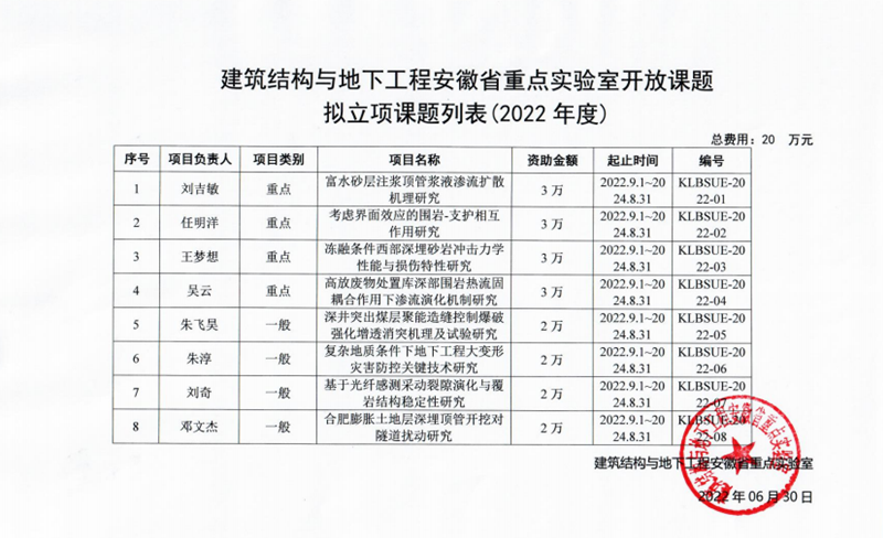 根据《beat365在线唯一官网科研平台开放课题管理办法(试行)》和《建筑结构与地下工程安徽省重点实验室开放课题管理办法(试行)》文件规定,本实验室按照公平公正、择优支持”的原则,采取自由申请、实验室初审、学术委员会终审的程序遴选确定8个项目准予立项,现将拟立项项目予以公示。公示期为2022年7月5日-7月7日,如有异议,请向建筑结构与地下工程安徽省重点实验室反应。
