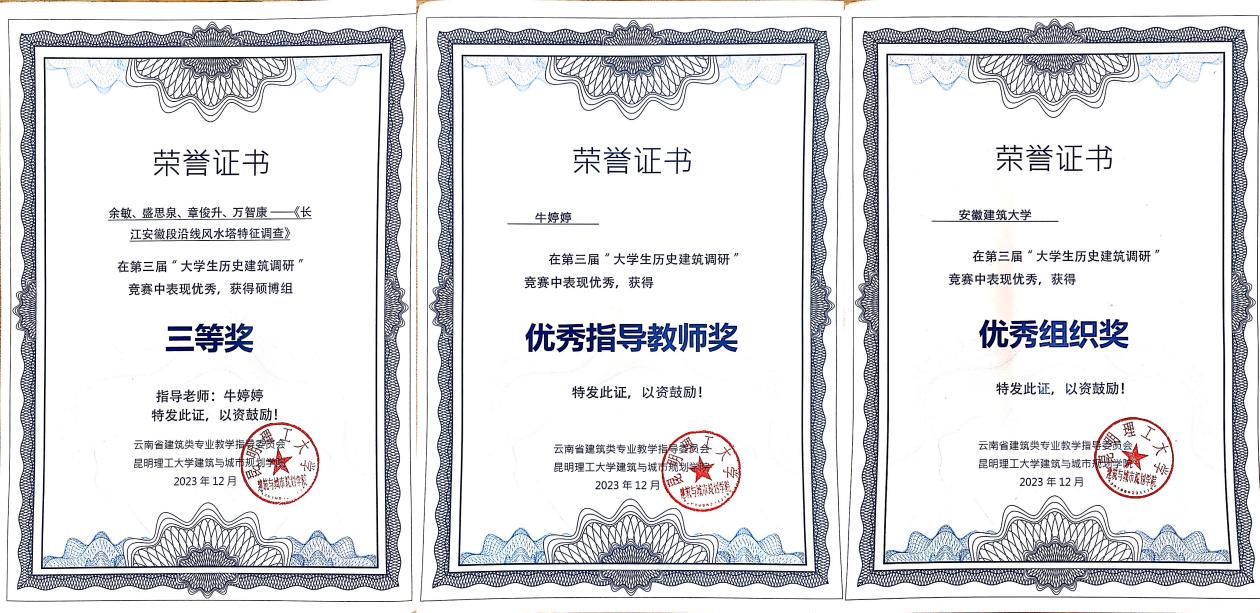 本网讯 近日,在由云南省建筑类专业教学指导委员会和昆明理工大学建筑与城市规划学院主办的“第三届大学生历史建筑调研”竞赛中,建规学院建筑学研究生余敏、盛思泉、章俊升、万智康提交的《长江安徽段风水塔特征调查》荣获硕博组三等奖。牛婷婷副教授获优秀指导教师奖,beat365在线唯一官网获优秀单位组织奖。