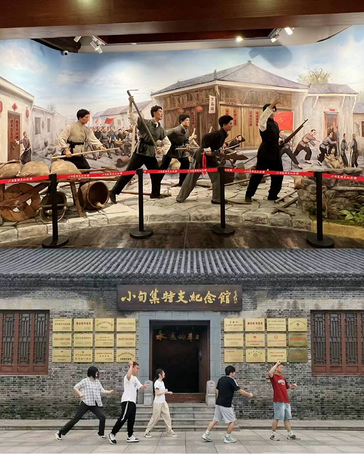 城乡规划专业学生党支部学生党员代表、青年先锋团的退役大学生士兵代表、安徽省弘扬社会主义核心价值观名师工作室逗留工作室成员在小甸集特支纪念馆前利用拍摄复制历史名场面转场短视频的方式,重现“瓦埠暴动”历史瞬间,让同学在镜头前倾情演绎历史片段,沉浸式感受到人民群众的武装斗争精神,体会安徽省“第一面党旗”升起的澎湃,发出当代青年爱国的强音。