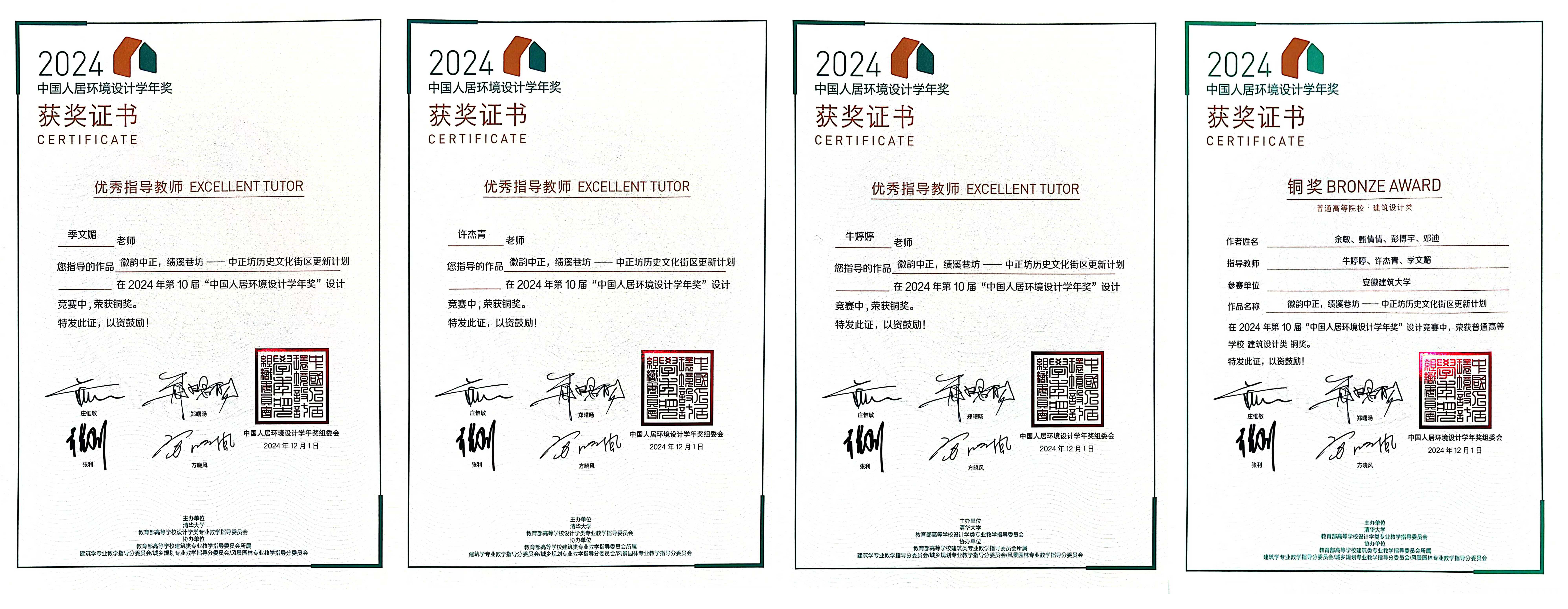 本网讯 近日,由清华大学与教育部高等学校设计学类专业教学指导委员会主办的“第十届中国人居环境设计学年奖”竞赛中,beat365在线唯一官网研究生余敏、甄倩倩、彭博宇、邓迪凭借作品《徽韵中正,绩溪巷坊——中正坊历史文化街区更新计划》荣获建筑设计组铜奖。