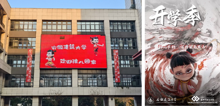 “哪吒闹海迎新岁,春风化雨润桃李。学子归校启新程,壮志凌云展宏图。”竖幅和哪吒主题精心设计的返校海报,以不同方式为新学期开学营造氛围,帮助学生尽快进入学校里的学习和生活状态。