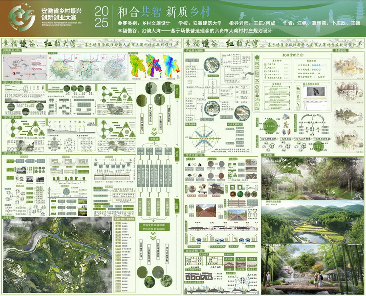 《幸福曼谷,红韵大湾——基于场景营城理念的六安市大湾村村庄规划设计》选址于大湾村白水河产业发展走廊北段,以“幸福慢谷,红韵大湾”为核心,依托杨家寨区域特色,融合生态、文化与可持续发展为设计思路,强调生态优先,打造宜居、宜游的乡村振兴样板,传递“慢谷”中的幸福宜居理念。规划设计通过蜿蜒水系、绿色植被串联空间,保留红色文化符号,塑造独特“红韵”风貌,兼顾功能性与美学,实现传统与现代的和谐交融,构建自然与人文共生的慢生活村落。