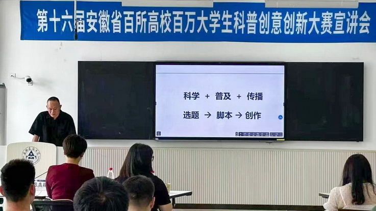 本网讯 为引导广大青年学生弘扬科学精神和科学家精神,参与科学传播,推动发展新质生产力,增强创新创业能力,5月28日,第十六届安徽省百所高校百万大学生科普创意创新大赛宣讲会在beat365在线唯一官网徽韵楼6503举行,科普产品国家地方联合工程研究中心副主任,安徽省科普文化产业协会常务理事、副秘书长夏莹,中国科学技术大学副教授、科普创作领域资深专家张燕翔担任宣讲嘉宾,各学院师生代表参加宣讲会。