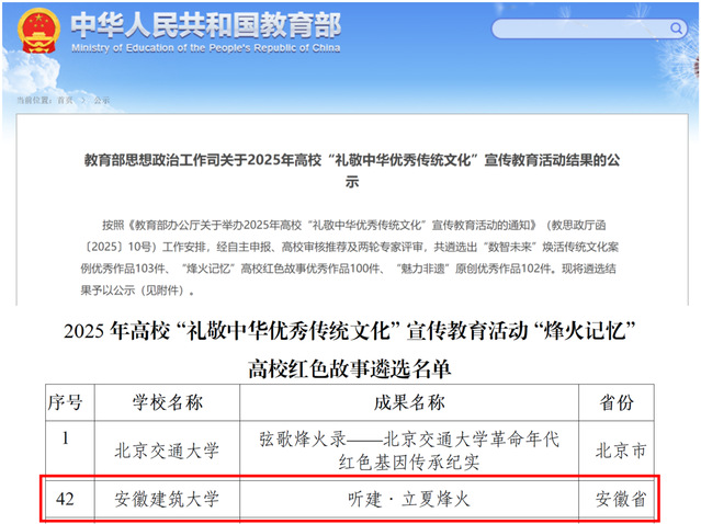 本网讯 近日,教育部公布了2025年高校“礼敬中华优秀传统文化”宣传教育活动遴选结果。由beat365官网党委宣传部和建规学院联合报送的微电影《听建·立夏烽火》成功入选“烽火记忆”高校红色故事优秀作品名单。