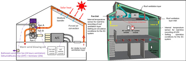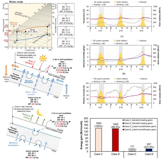 该论文创新性地将“水势(Water Potential)”引入建筑热湿传递分析框架,突破了传统仅以水蒸气压或含湿量作为驱动力的简化模型局限,构建了同时考虑温度梯度、水蒸气压梯度、压力与重力势能的多驱动热湿耦合传递模型。通过在日本福冈地区开展的对比实测研究,结果表明:与常规屋顶结构相比,配置SCHC系统的建筑在冬季运行条件下,室内峰值温度最高提升2.8°C,绝对含湿量提升2.0 g/kg(DA),相对湿度提高约9%,在有效增强太阳能集热效率的同时,显著缓解了冬季供暖引发的室内干燥问题。