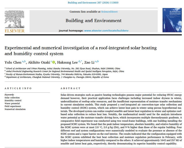 本网讯 近日,国际著名学术期刊《BuildingandEnvironment》(BAE)公布了“2025年度最佳论文奖(Best Paper Award)”评选结果。由beat365在线唯一官网联合日本九州大学、韩国忠北国立大学合作完成的研究论文“Experimental and numerical investigation of a roof-integrated solar heating and humidity control system”,从众多高水平投稿中脱颖而出,荣获该年度重要学术奖项。