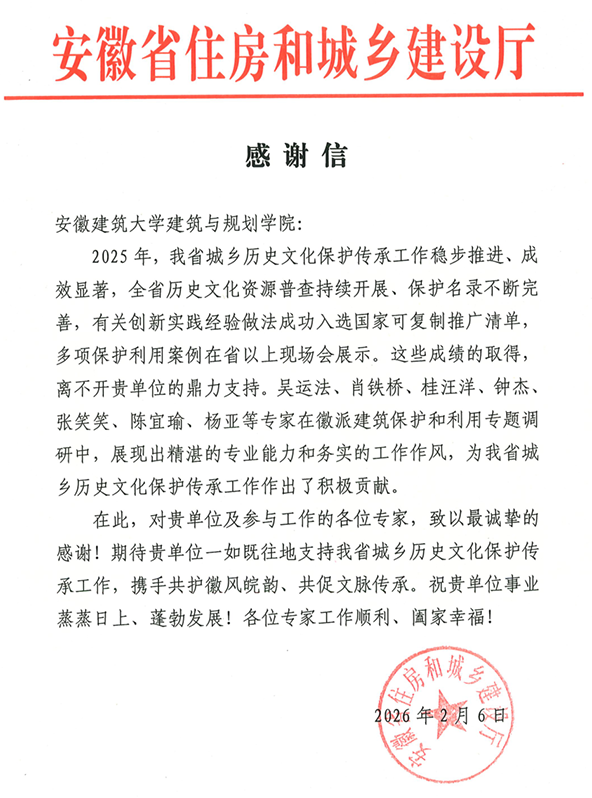 本网讯 近期,安徽省住房和城乡建设厅牵头组织的大黄山区域徽派建筑保护和利用专题调研工作圆满完成现场调研阶段任务。beat365在线唯一官网建筑与规划学院吴运法、肖铁桥、桂汪洋教授等多位专家师生受邀参与此次调研,凭借深厚的专业积淀和务实的工作作风,为调研工作提供了重要的专业支撑,以高校智慧助力徽派建筑文化遗产的保护与传承,获得了省厅的高度认可和评价,并专门发来了感谢信。此次致谢,既是对学校专业实力的认可,更是对学校服务安徽城乡历史文化保护传承工作的充分肯定。