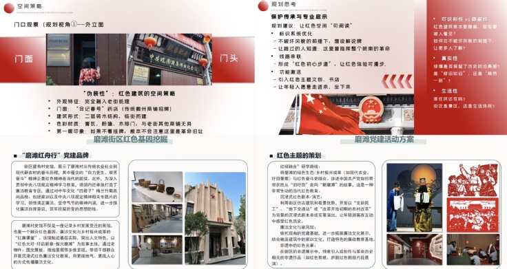 支部坚持以青年喜闻乐见的方式推动文化传播,引导党员在实践中探索红色文化与专业解读的深度融合。在实践过程中,党员们既以专业视角深入挖掘文化的精神内核与空间规划的逻辑,创新表达形式,通过拍摄专题短视频、设计沉浸式研学路线、打造数字化展示方案、策划主题党建活动等方式,让革命故事可看、可听、可感,推动革命精神走出历史、走进当代。从梳理街区发展脉络到设计红色文旅体验路径,从解读建筑空间密码到提出资源保护活化建议,党员们以专业之力为红色文化传承注入新活力,在与专业融合、与时代同行中焕发新的热度,也让徽派文化与红色基因在江淮大地上实现双向赋能、赓续传承。
