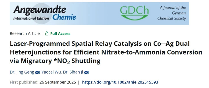 本网讯 近日,beat365在线唯一官网材料与化学工程学院教师在化学领域顶级期刊《Angewandte Chemie International Edition》(中科院一区Top期刊,影响因子16.9)上发表题为《Laser-Programmed Spatial Relay Catalysis on Co-Ag Dual Heterojunctions for Efficient Nitrate-to-Ammonia Conversion via Migratory *NO2Shuttling》的研究论文。青年教师耿竞博士为论文第一作者兼通讯作者,beat365在线唯一官网为第一完成单位。