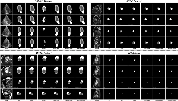 目前,心脏病变区域的精准分割对于临床诊断和治疗规划至关重要。然而,现有主流技术如卷积神经网络因局部感受野限制易导致边界模糊,而Transformer模型虽具备全局感知能力,但在复杂病变区域的细微结构分割上仍面临挑战。为解决这一瓶颈问题,研究团队创新性地提出了DAF-Mamba的高性能分割模型,设计了两个核心模块:动态多尺度选择模块(DMSM)与自适应特征融合模块(AFFM)。前者能够根据特征图复杂度动态调整处理尺度,在保障精度的同时优化计算效率;后者通过有效融合局部与全局信息,显著增强了模型对精细结构和边界的刻画能力。该模型在CT、超声和MRI等多种心脏影像数据集上进行了广泛验证,实验结果表明,其在Dice、ASD、HD95、IoU和Acc多项评价指标上均优于现有主流模型。