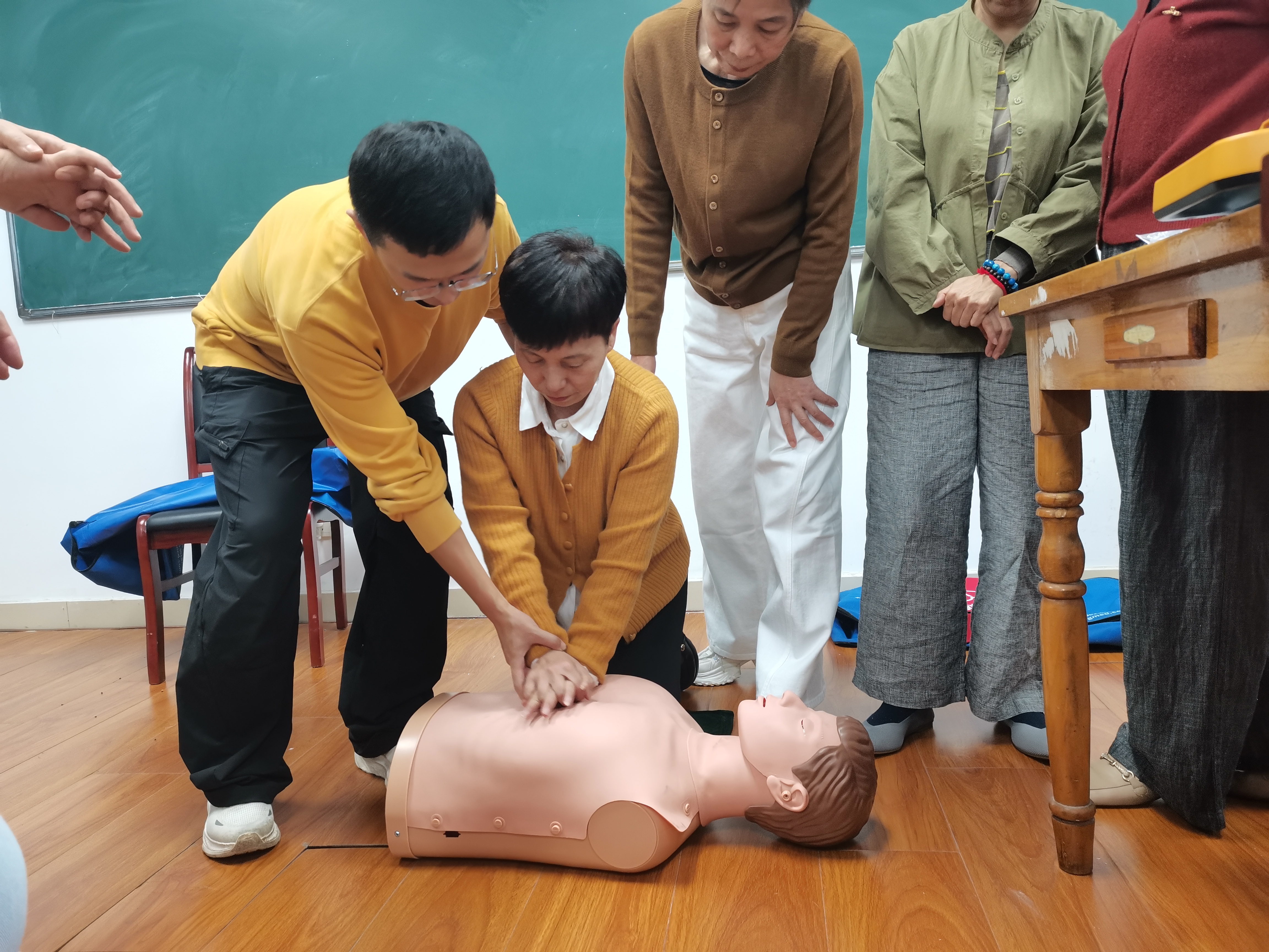 培训中,校医院工作人员以通俗易懂的语言通过理论讲解与实际操作相结合的方式,围绕气道异物梗阻、心肺复苏与AED的使用方法等技能展开教学。他们详细讲解了救护知识要点,同时借助模拟人与AED教学模具进行现场演示,手把手指导每位参训人员进行练习,及时纠正动作偏差。实操环节中学员们通过反复练习,初步掌握了应急救护技能。