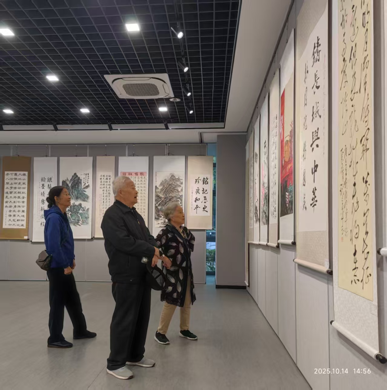10月14日下午,学校老年书画摄影研究会组织会员前往合肥老年大学,参观市老干部局开展的“银发丹心忆抗战 翰墨赓续新征程”全市老干部系统书画摄影展。