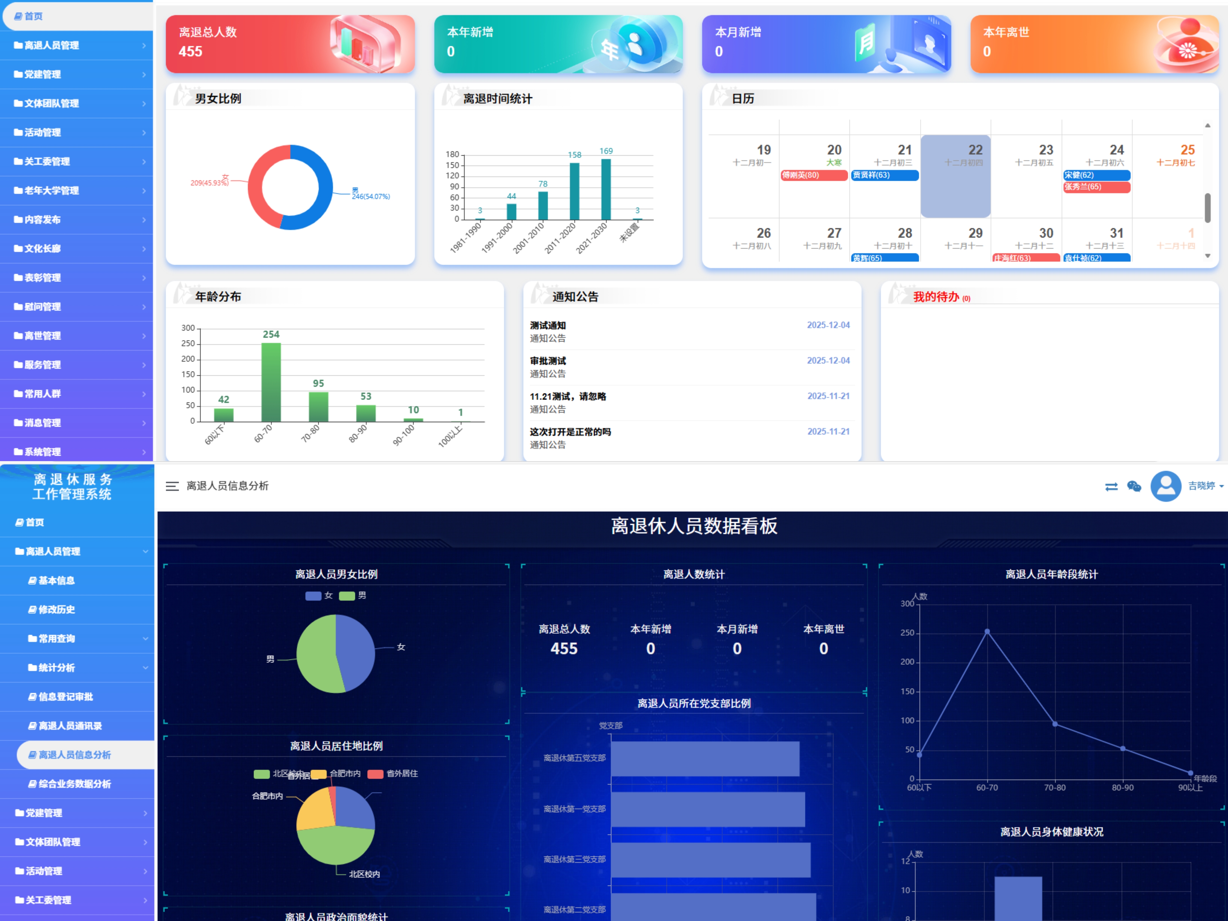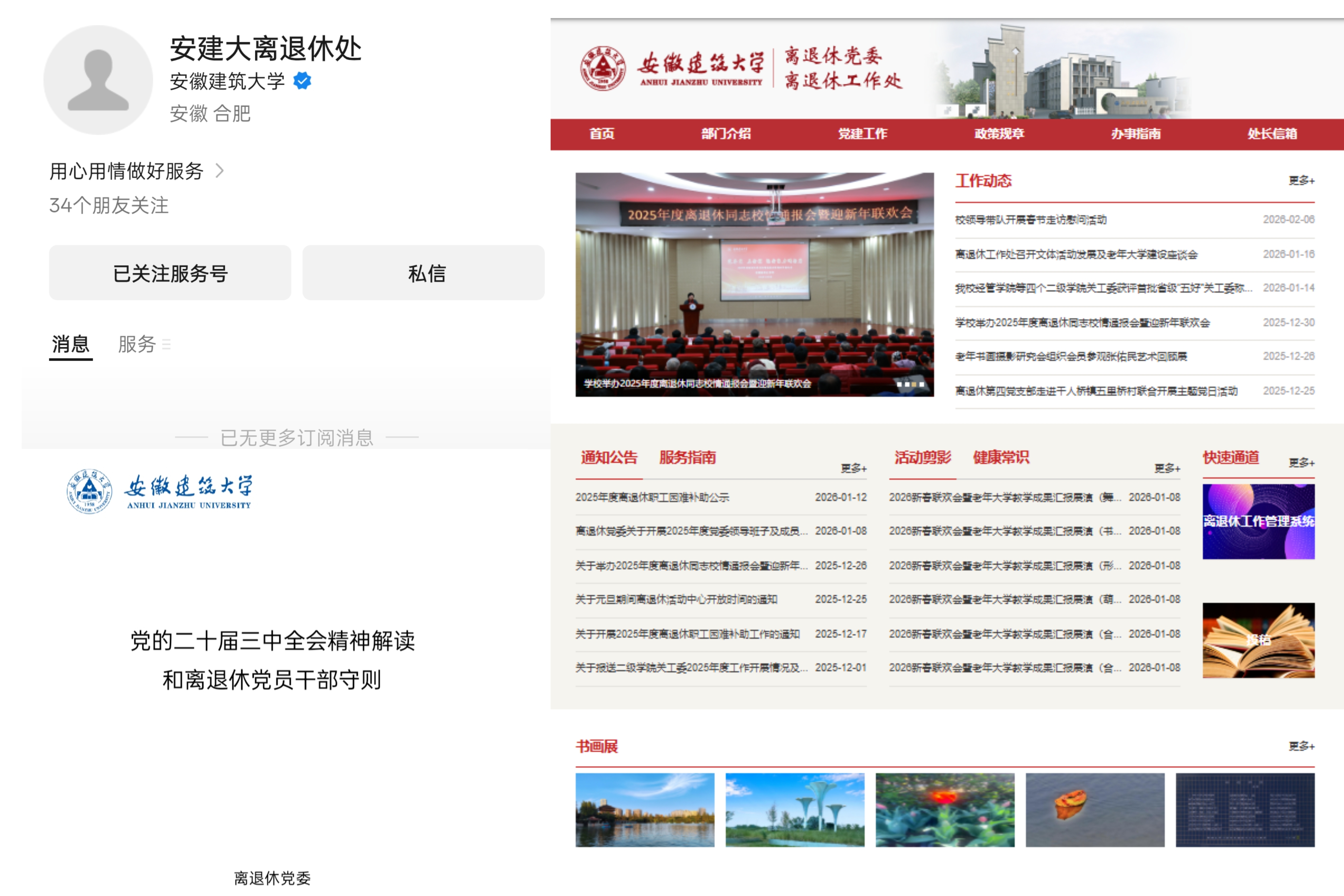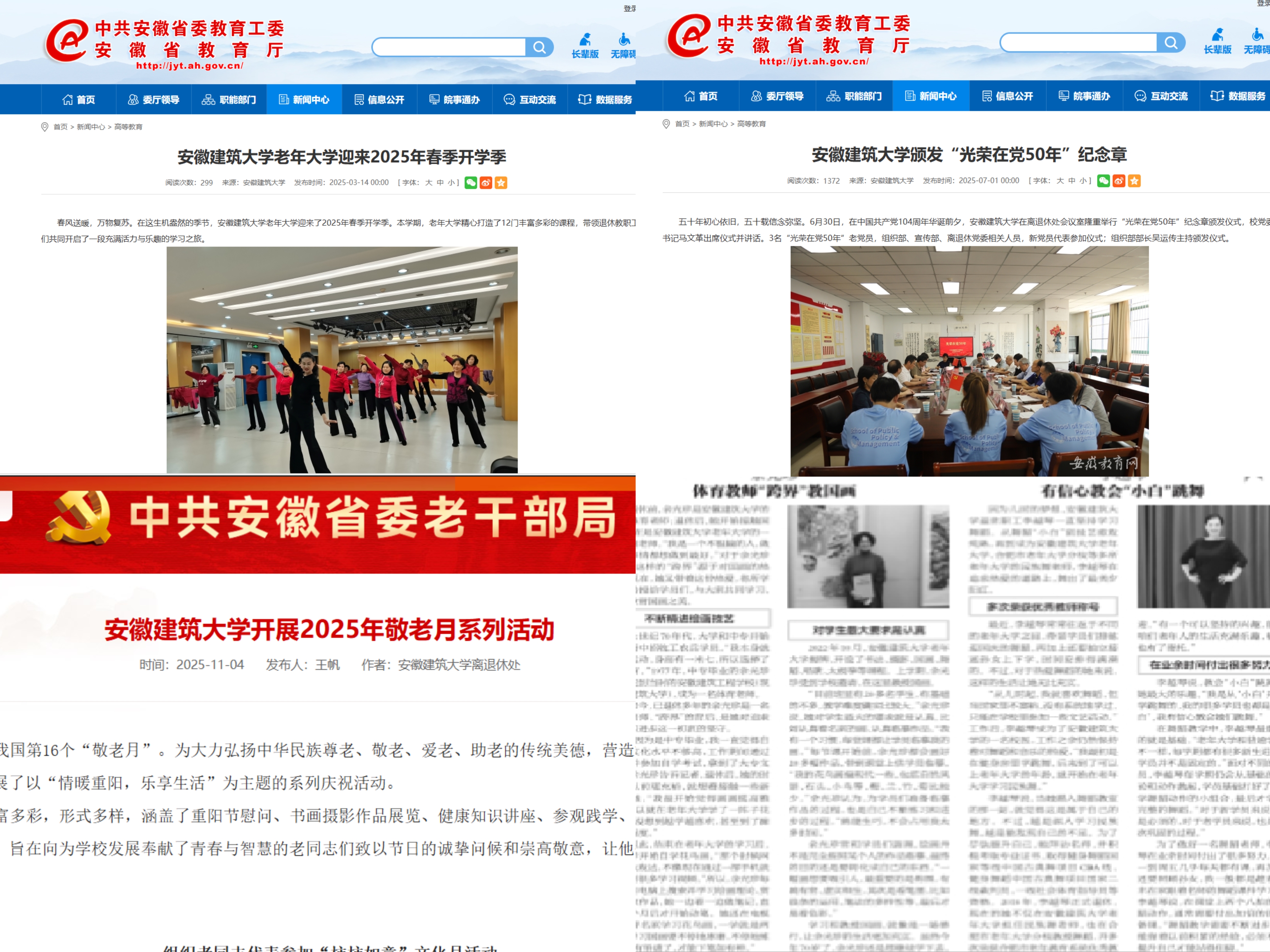 持续加强自身建设,推动工作提质增效。夯实党建根基,规范支部建设,编印《离退休党员干部守则》并发放至全体老同志,作为党支部理论学习、主题党日活动的核心学习材料,有效强化行为规范与自我管理。支部建设取得突破,第一党支部顺利通过“双创”样板党支部达标验收,第四党支部积极参评省委老干部局“全省示范党支部”,示范培育工作扎实推进,引领力持续增强。拓展宣传阵地,打造网上家园,全面推广“建大离退休”服务号,年均发布新闻26篇,及时报道校情通报会、联欢会、主题党日、文体活动及关工委获奖等重要动态,其中党建主题活动、敬老慰问、老年大学建设等特色工作获省教育厅、省委老干部局网站及《新安晚报》等媒体报道19篇,信息渠道显著拓宽,老同志联系更加紧密。同步优化网站功能,设置“服务指南”“活动剪影”“健康常识”等专栏,将办事窗口升级为有温度的“网上家园”。深化信息赋能,提升服务精度,离退休信息管理系统完成验收并正式投用,实现人员信息管理、活动组织、政策查询等多功能一体化集成,工作效率与管理服务精准度显著提升。