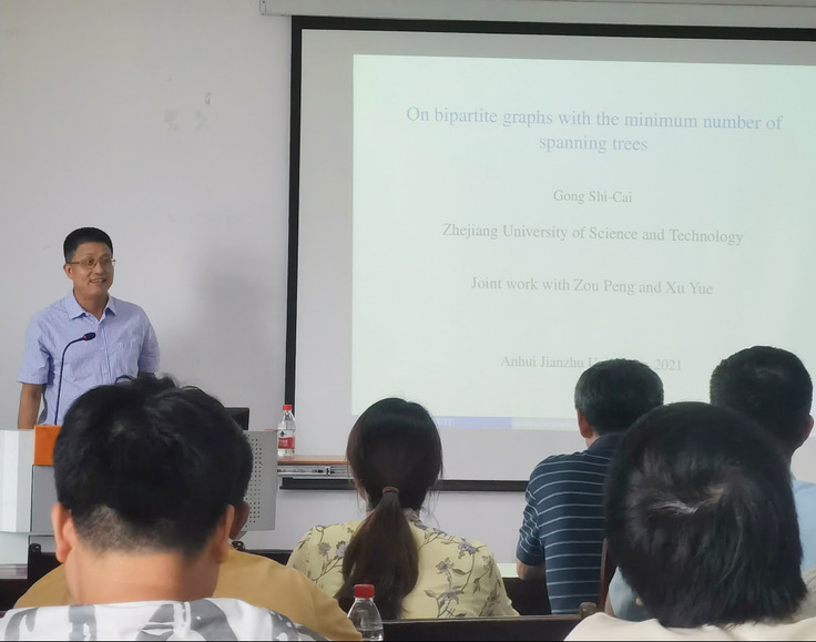 数理学院院长戈慈水首先对范益政院长、汪毅副院长和龚世才教授莅临beat365官网指导工作,表示热烈地欢迎,并对三位老师进行了简短地介绍。接着,浙江科技学院的龚世才教授作了题为“On bipartite graphs with the minimum number of spanning trees”的学术报告,分享了自己最新的研究成果以及研究过程中的心路历程,并提出了若干可以进一步研究的问题。