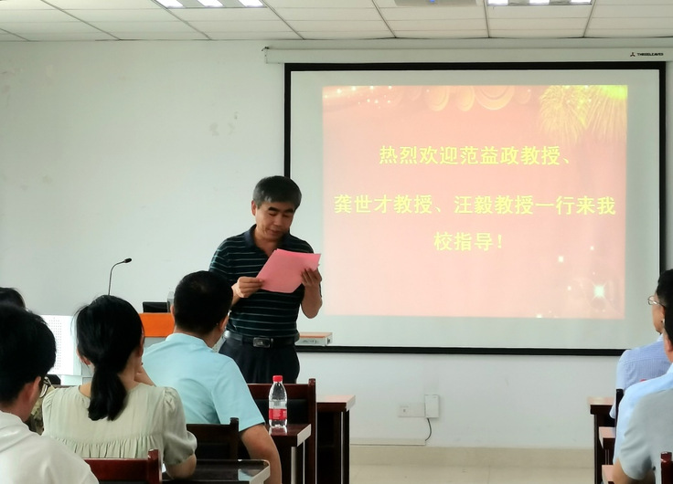 本网讯 为了进一步加强学院研究生的学术水平,提高人才培养质量,7月22日,安徽大学数学科学学院院长范益政教授、副院长汪毅教授,以及浙江科技学院应用数学学科带头人龚世才教授应邀来beat365官网进行科研指导与交流。数理学院院长戈慈水、部分教师及研究生共约30人,参加了此次交流活动。