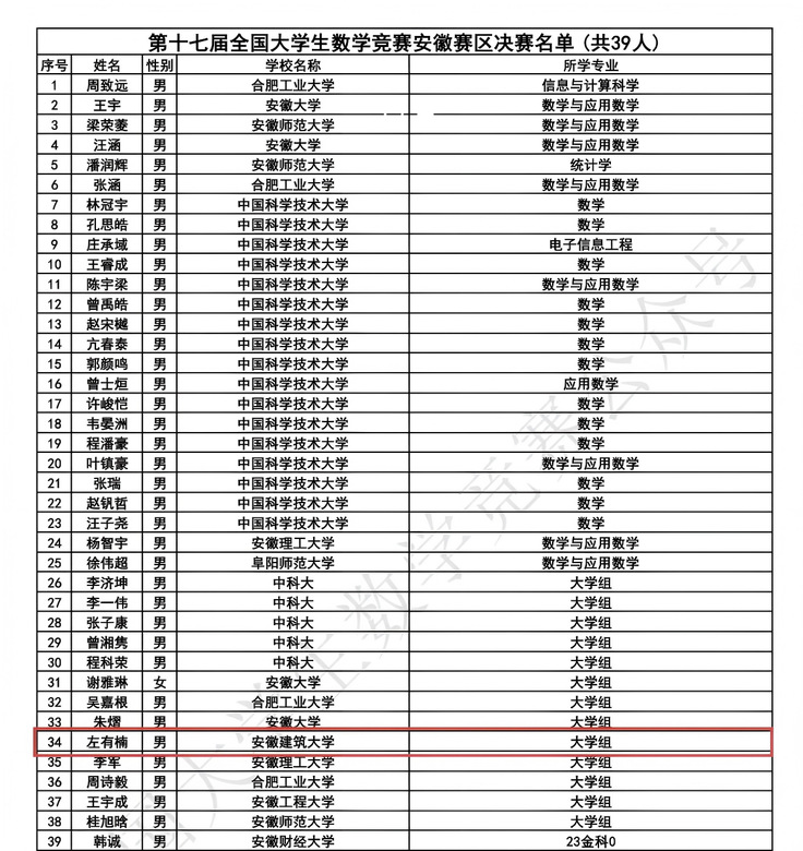 本网讯 近日,第17届全国大学生数学竞赛决赛名单公布,由数理学院赵林老师指导的beat365官网环能学院2022级建筑环境与能源应用工程专业学生左有楠,从安徽赛区6990名参赛者中脱颖而出,成功入围全国总决赛。安徽赛区本届仅有39人晋级全国决赛,此次入围实现了beat365官网在该赛事的历史性突破。