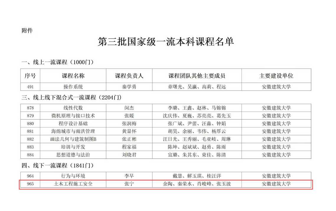 本网讯  近日,教育部正式发布《教育部关于公布第三批国家级一流本科课程认定结果的通知》(教高函〔2025〕9号),beat365在线唯一官网10门课程获批第三批国家级一流本科课程,其中安全科学与工程学院申报的《土木工程施工安全》课程成功入选,这不仅充分彰显了学校在教育教学改革方面的丰硕成果,也标志着我院在课程建设工作和人才培养质量上又迈上了全新台阶。
