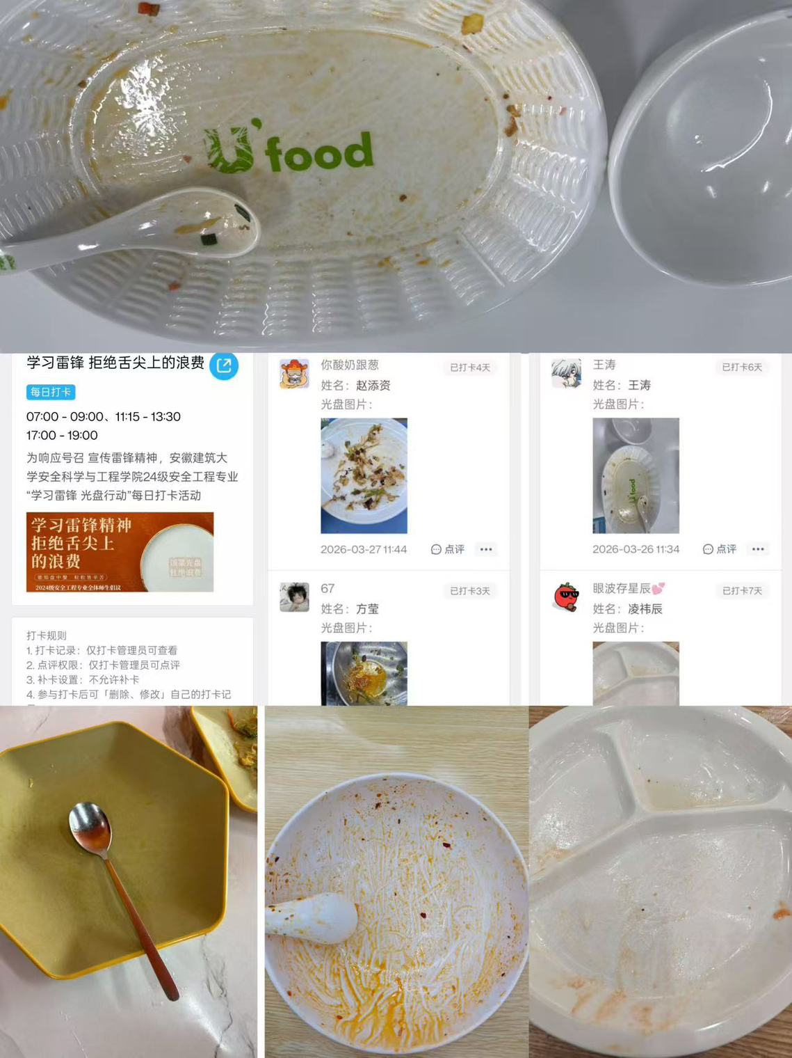 为响应勤俭节约的号召,传承中华民族优良传统,学院发起“光盘行动”线上打卡活动,一日三餐,同学们光盘后拍照上传,根据光盘打卡次数,评选“光盘达人”,鼓励同学们从点滴做起,珍惜每一粒粮食,将勤俭节约的美德内化于心、外化于行,以实际行动践行雷锋精神中的节约理念。