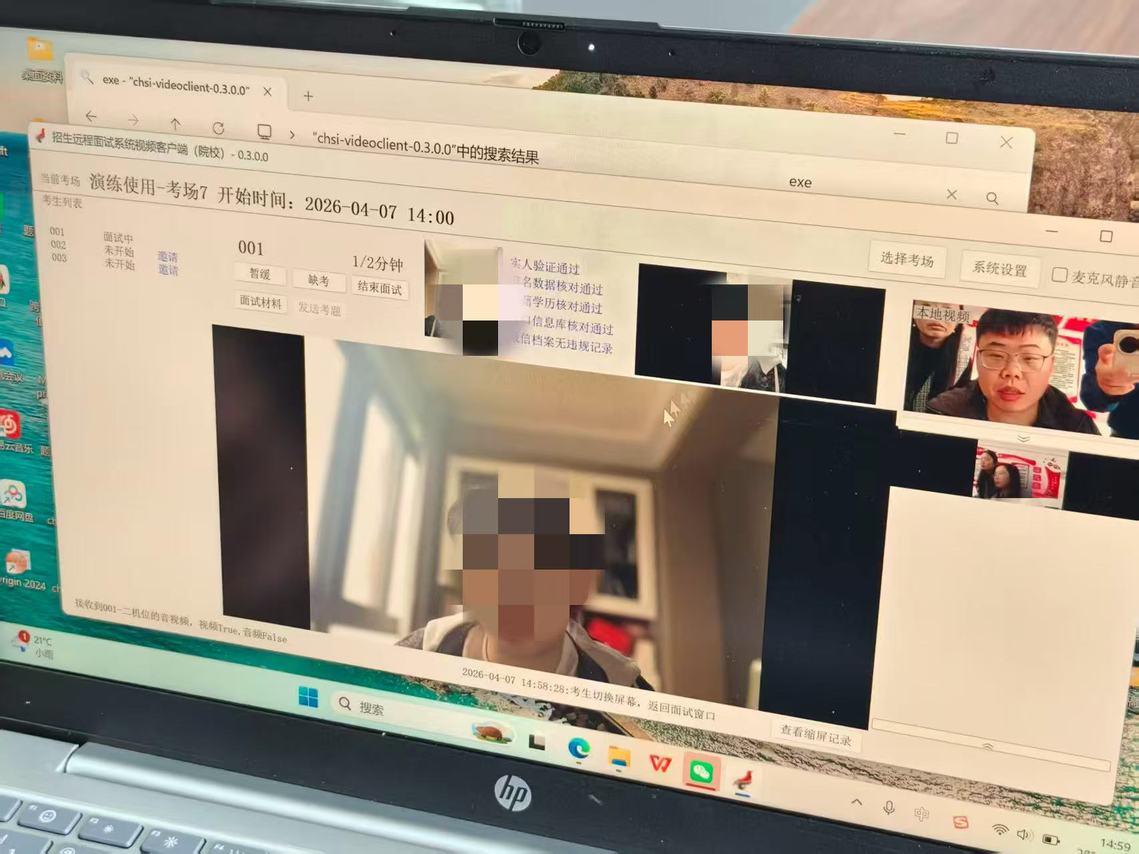 理论培训结束后,实战模拟演练正式启动。演练严格按照研究生远程面试实际流程开展,演练前建立六个远程面试考场,调剂考生、主候考官、工作人员全部到位,全程还原候考实人验证、双机位测试、邀请面试、成绩录入等各个环节。演练过程中,考生依次进入远程面试考场,主候考官按照面试流程进行了面试,工作人员做好设备保障,全面检验了远程面试平台的稳定性、操作流程的规范性以及各岗位人员的协同配合能力。