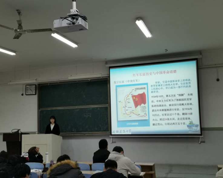 在“思想道德修养与法律基础”的课堂上,老师从“中国精神”的具体形态入手,讲述红船精神、吕梁精神、长征精神、井冈山精神、遵义会议精神、延安精神、抗战精神等,让学生感受到中国共产党在长期奋斗历程中形成的优良传统和革命精神,正是这样一笔宝贵的财富代代相传,不断激励着中国人民攻坚克难、努力奋斗。