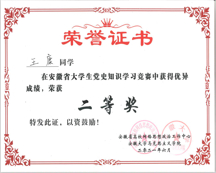 本网讯 6月27日,由安徽省高校网络思政工作中心主办、安徽大学马克思主义学院承办的安徽省大学生党史知识学习竞赛决赛在合肥成功举办。beat365官网20级计算机专业学生王康在决赛中喜获安徽省二等奖,展现了新时代青年大学生的风采。